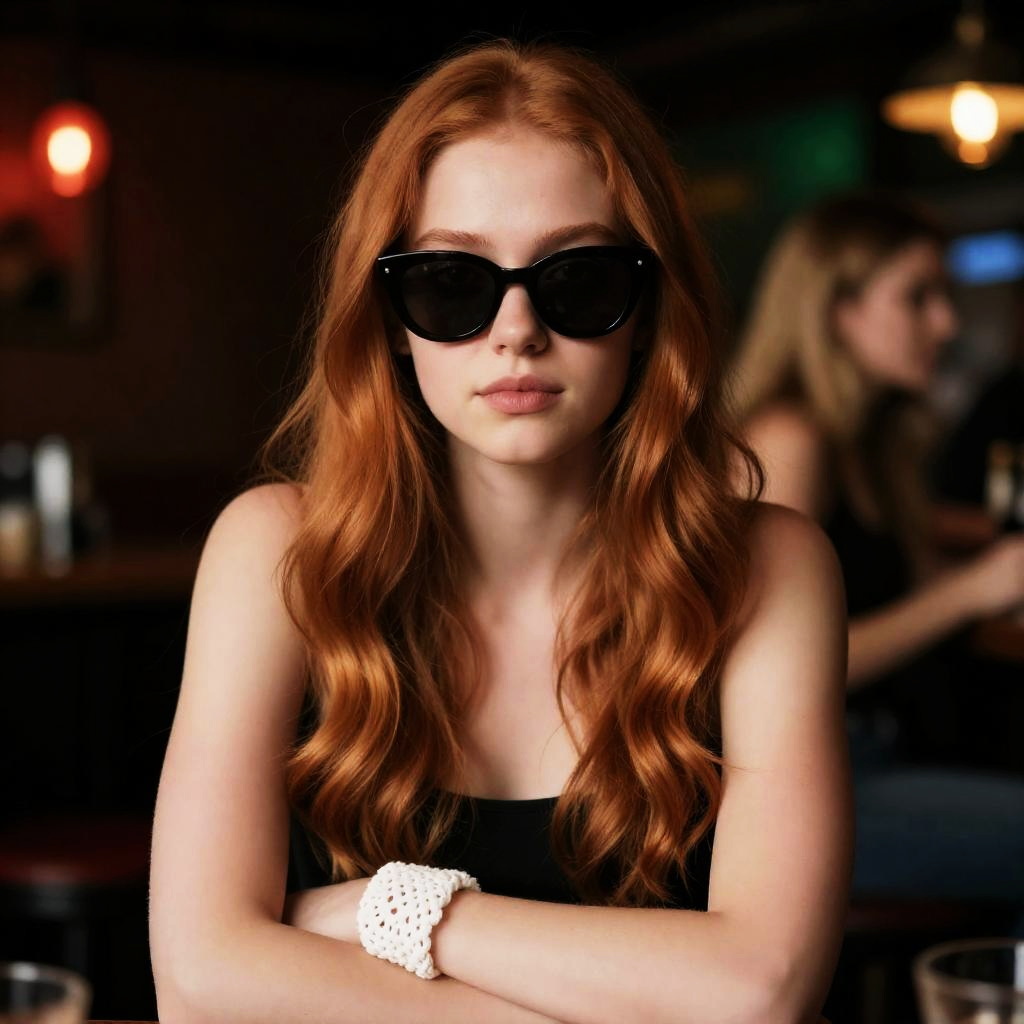 Photograph of a young woman with long, wavy, reddish-blonde hair, wearing black sunglasses and white crochet wristbands. She sits with arms crossed, in a dimly lit bar with red and green lighting. Another blonde woman is blurred in the background. The woman in the foreground has a neutral expression.