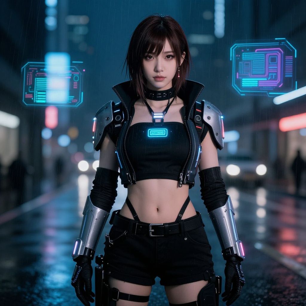 Photorealistic CGI image of an Asian woman in a cyberpunk city at night. She has short, dark brown hair and wears a black, midriff-baring crop top with metallic shoulder armor and matching arm guards. Her black shorts are paired with a black choker and a futuristic blue neon chest emblem. She has a focused expression and stands in the rain on a wet, reflective street, with blurred neon lights and cars in the background. Two holographic blue neon squares float on either side of her head, adding to the cyberpunk aesthetic.