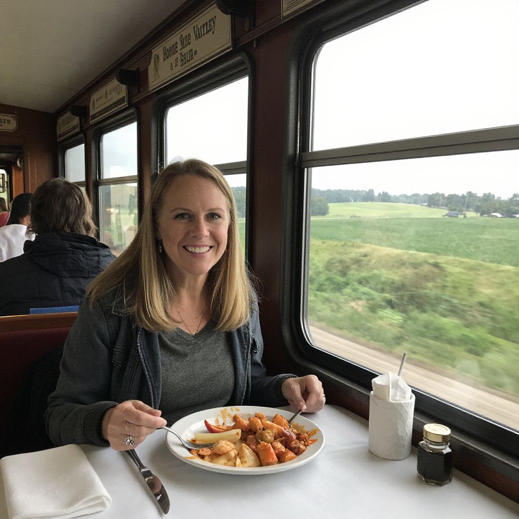 Smiling woman enjoying a meal aboard the Boone Scenic Valley Railroad Dinner Train in Iowa, with expansive green fields and scenic views visible through large windows.