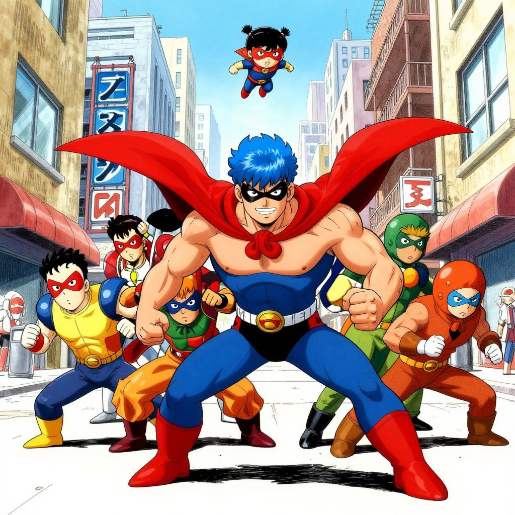 Illustration of a team of bumbling superheroes in a vibrant city street, drawn in a bold and slapstick manga style reminiscent of Fujio Akatsuka. The scene features a muscular male hero with spiky blue hair and a red cape, accompanied by multiple smaller masked sidekicks and colorful characters, including a tiny superhero flying above. The background showcases tall city buildings with various shop awnings and windows, adding depth and urban atmosphere to the dynamic heroic action.