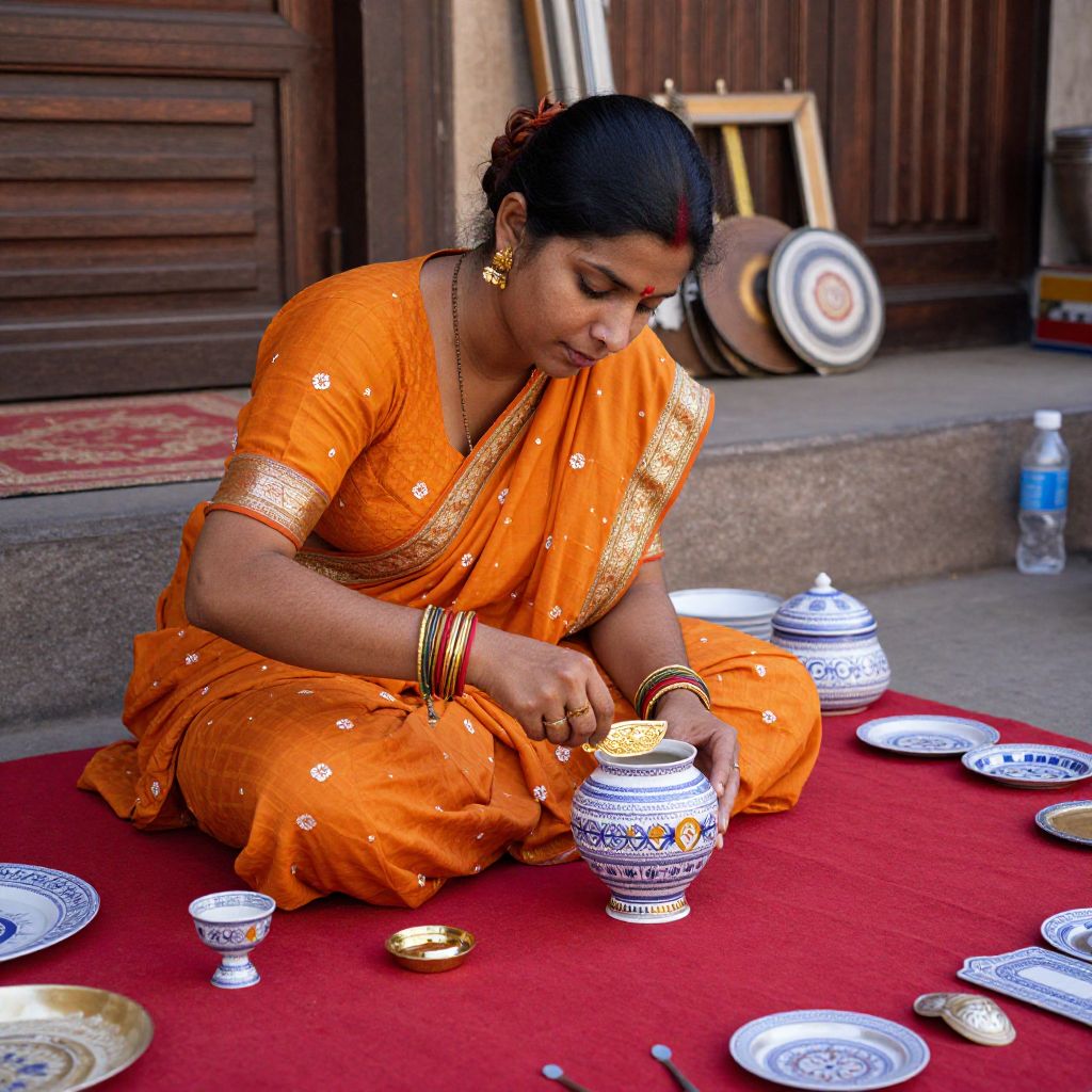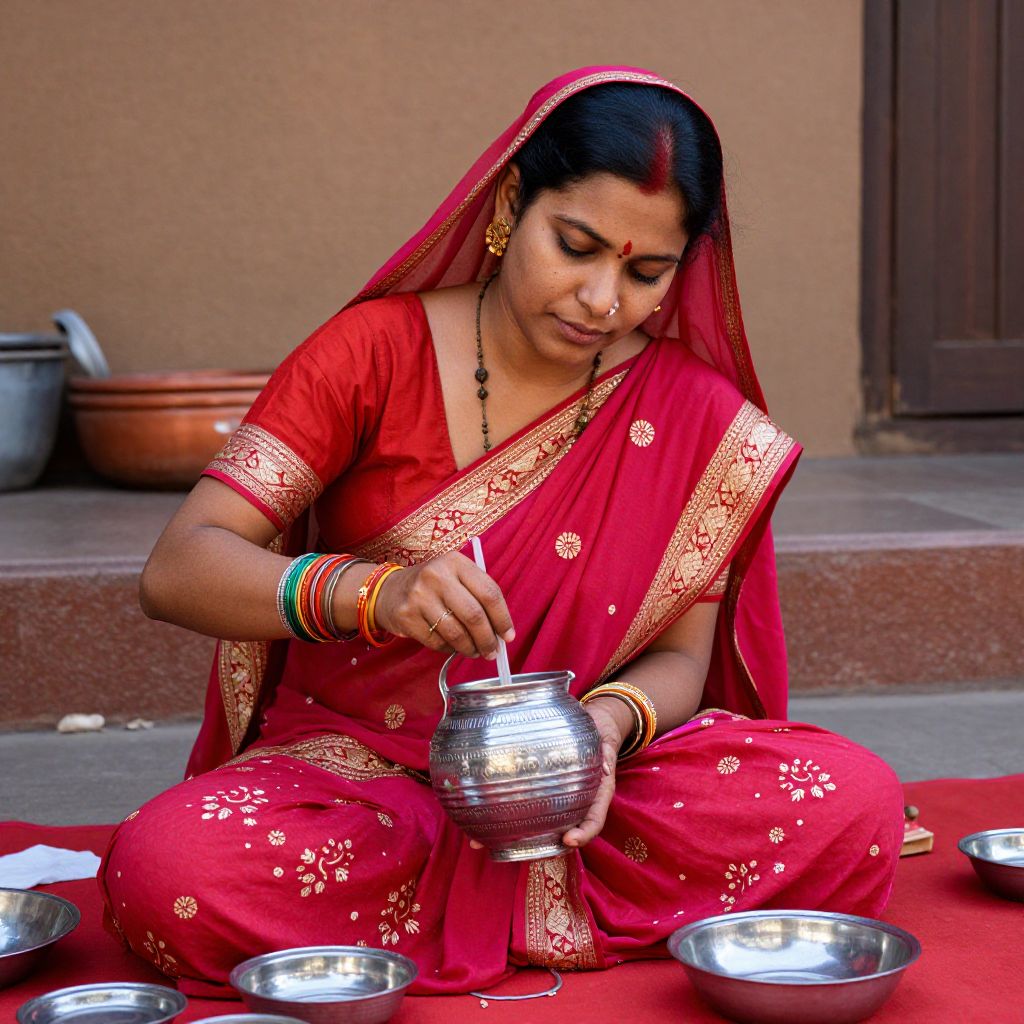 Photograph of an Indian woman with medium brown skin and black hair, wearing a red saree with gold embroidery, a matching red veil, and multiple colorful bangles. She is sitting cross-legged on a red cloth, pouring water from a silver pot into a silver bowl. Her forehead has a red bindi, and she is focused on her task. The background features a brown wall and a metal bucket. Several silver bowls are scattered around her. The setting appears to be outdoors on a stone-paved area. The image is vibrant with rich colors and detailed textures.