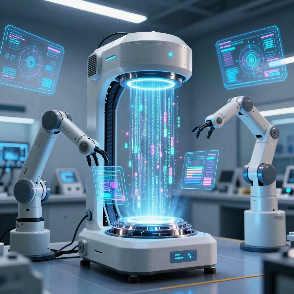 AI generated generator, a futuristic machine with glowing circuits and metallic surfaces, producing streams of complex digital code and holographic data, set in a high-tech lab with neon lighting and cybernetic elements, ultra-detailed.