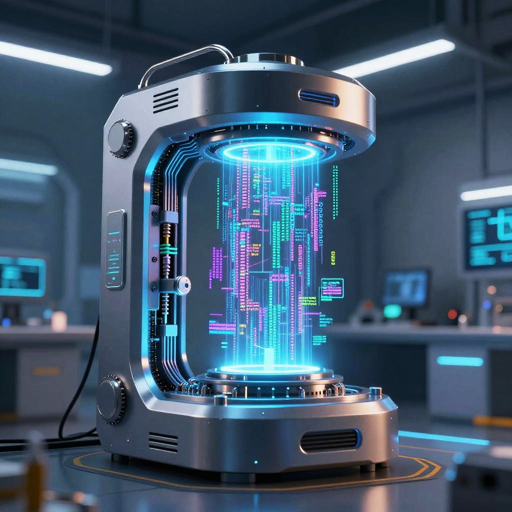 Photograph of a futuristic, metallic cylindrical device with a transparent glass-like center, emitting vibrant, multi-colored blue and purple digital lights. The device, with sleek, silver buttons and vents, is centered on a shiny, circular platform in a high-tech laboratory setting. The background features blurred computer monitors and sleek, gray industrial walls with overhead fluorescent lights. The overall scene conveys a sci-fi atmosphere with a focus on advanced technology and digital visualization.