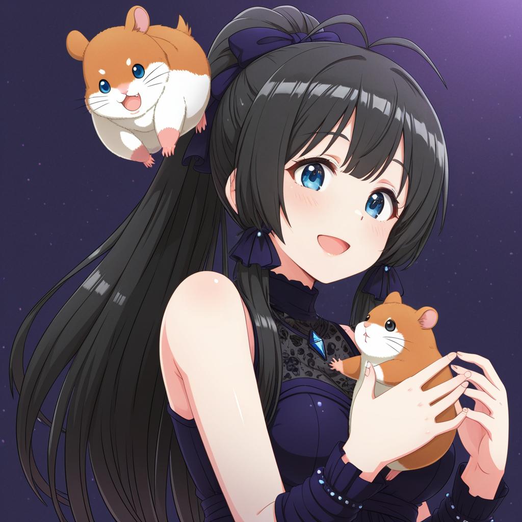 Hamuzou, idolmaster, 1girl, fang, blue eyes, black hair, long hair, antenna hair, ponytail, hair ribbon, medium breasts, hamster, animal, by artist yuureidoushi (yuurei6214), dark_illustrious