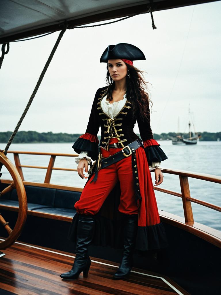 Realistic Woman Pirate, pirate woman in a red and black outfit standing on a boat