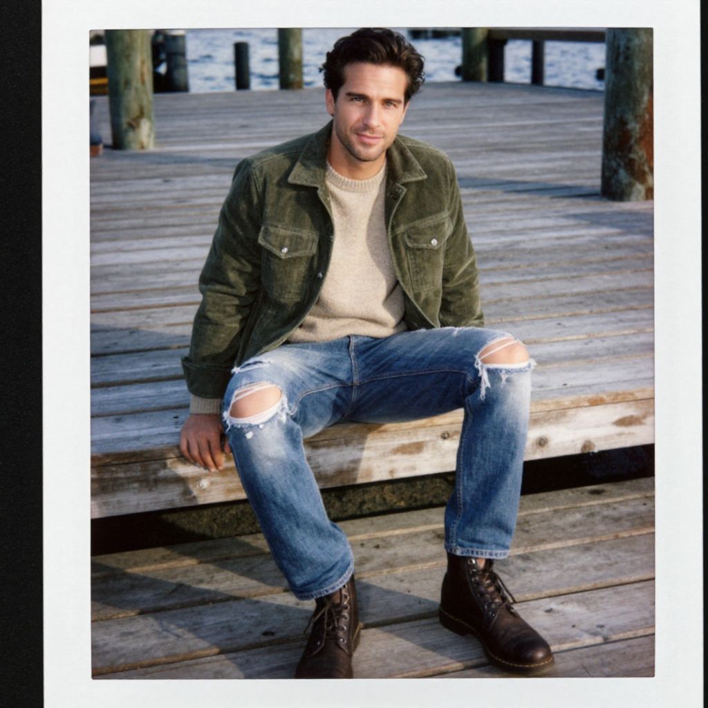 A man, forest green corduroy jacket, beige crew neck sweater, distressed slim jeans, dark brown lace-up boots, rustic wooden docks, instant film style, relaxed smile, warm sunlight filtering through. Man has masculine face and piercing eyes