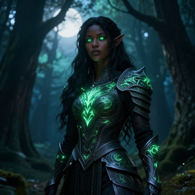 Digital art depicting a dark-skinned, elf-like woman with glowing green eyes and long, wavy black hair standing in a mystical forest. She wears intricately designed, dark metallic armor with glowing green runes, highlighting her chest, shoulders, and arms. The forest background is dense with tall, shadowy trees, and a faint, ethereal blue light filters through the foliage. Her pointed ears and intense gaze add to her otherworldly appearance. The overall mood is dark and mysterious, with a fantastical, magical atmosphere.