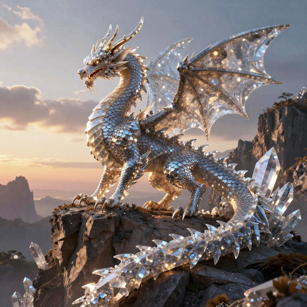 Crystallized dragon perched on jagged crystal cliffs, scales made of glistening crystals reflecting sunset hues, majestic and mythical creature, dramatic lighting, fantasy art style, richly detailed with a blend of organic and crystalline textures.
