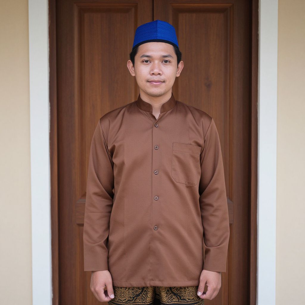 Simple Indonesian Costume, man in a brown shirt and blue hat standing in front of a door