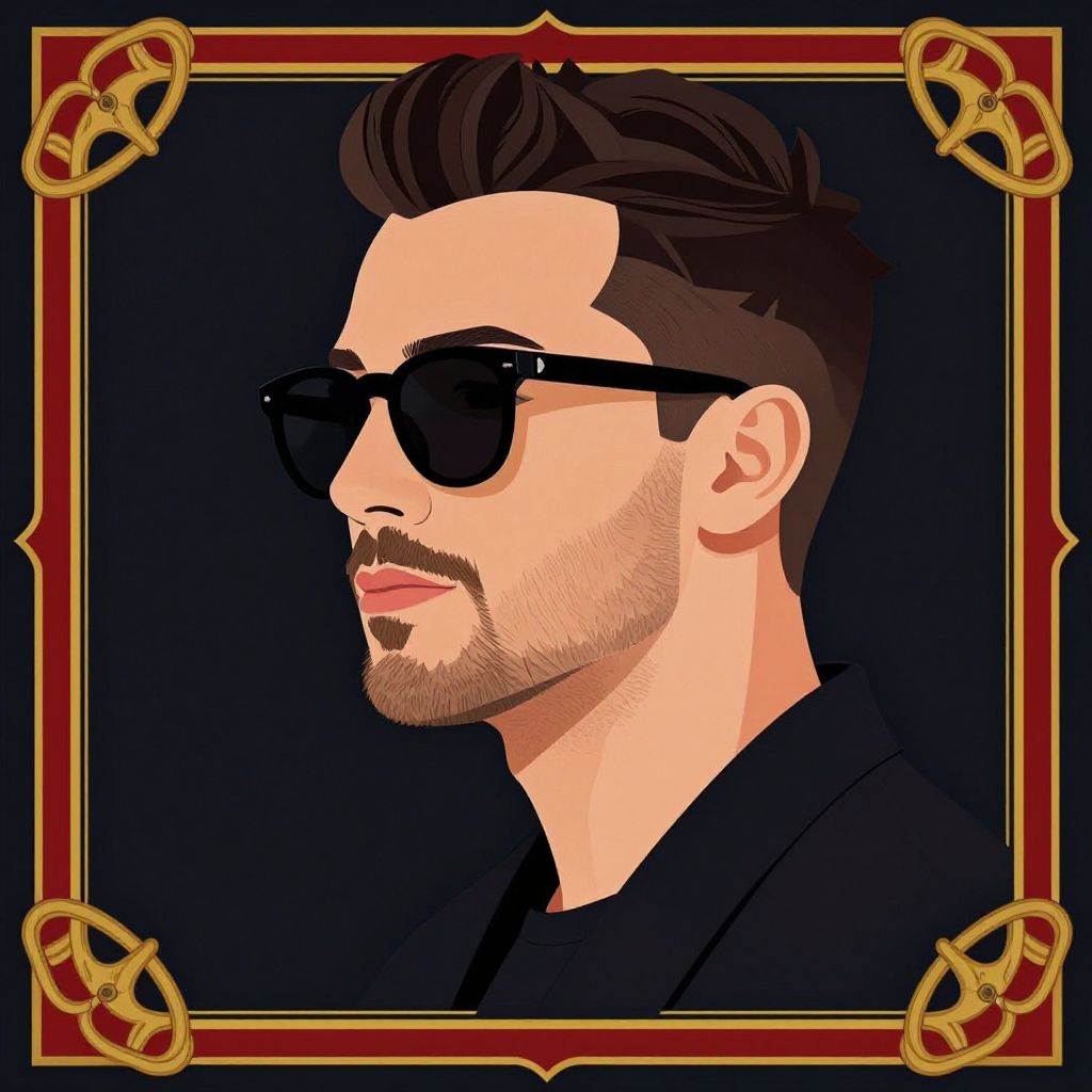 Digital portrait of a handsome man with dark hair, beard, black sunglasses, and black shirt, framed with ornate gold and red border.