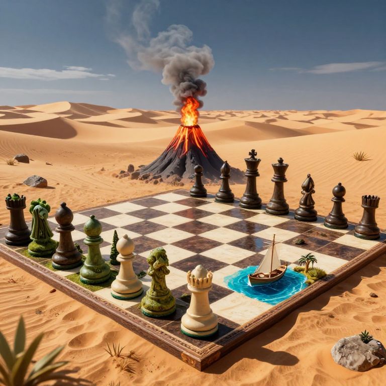 In a surreal 3D-rendered desert landscape, a giant chessboard emerges where each piece hosts a distinct ecosystem—forests flourish on the \"Pawns,\" a smoking volcano erupts atop the \"Knights,\" and a tranquil ocean cradles a small boat beneath the \"King,\" all set against a backdrop of dramatic lighting and vibrant, high-definition textures.