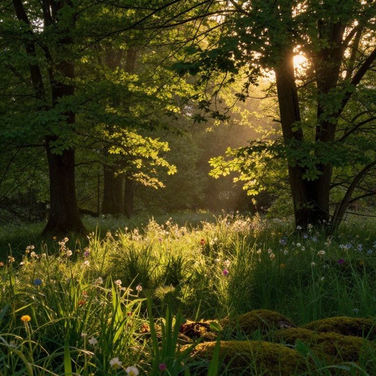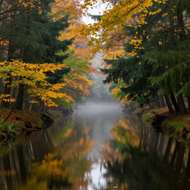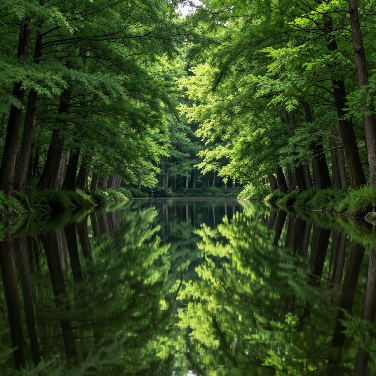 A tranquil forest mirrors its surroundings in a lake so perfectly that the trees appear to grow both upward and downward, creating a surreal, infinite corridor of life.