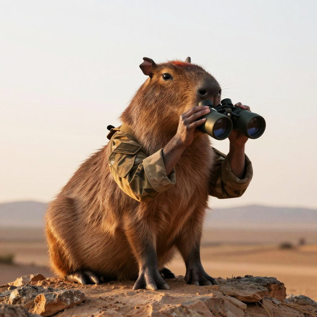 Military capybara in desert combat uniform, holding binoculars on a rocky hilltop, sunrise lighting, determined expression, realistic animal anatomy, cinematic style