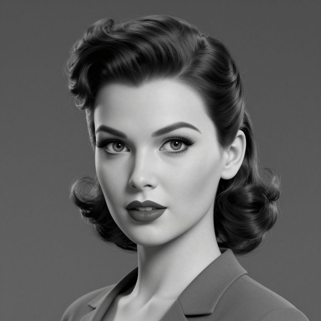 A high-definition black-and-white portrait featuring a woman with a classic retro-style pin-up hairdo, rendered in a polished 3D art style with dramatic lighting that accentuates her vintage aesthetic.