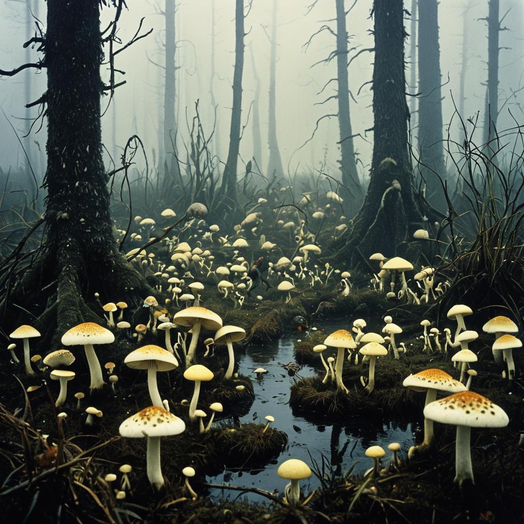 Roughness of a surreal scene crowded with many small figures of fairies frolicking in the magical garden eating mushrooms, arguing, rolling on the ground, and laughing, painted in the style of Claude Monet