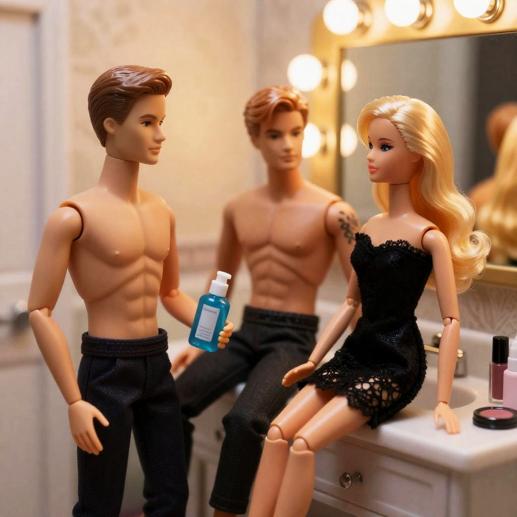 Photograph of three realistic-looking dolls in a bathroom. A nude male doll with a toned physique stands to the left, holding a blue bottle. A shirtless male doll with a muscular build and tattoos sits on a counter, facing a blonde female doll in a black lace dress, sitting on the counter. Background includes a lit mirror with warm lights and patterned wallpaper. The male doll on the left looks at the blonde doll, who gazes back at him. Makeup and cosmetic items are on the counter to the right.