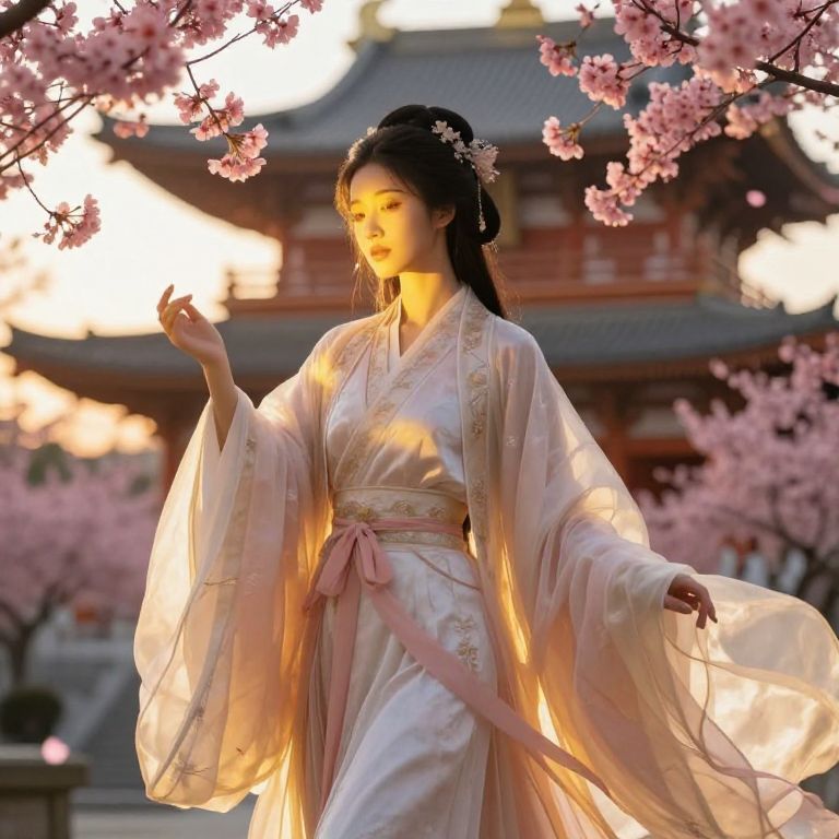 Asiangoddessoflove depicted as an ethereal figure in traditional flowing silk robes, surrounded by vibrant cherry blossoms and soft golden light, her eyes glowing with warmth and compassion, set against a mystical ancient temple at sunset.