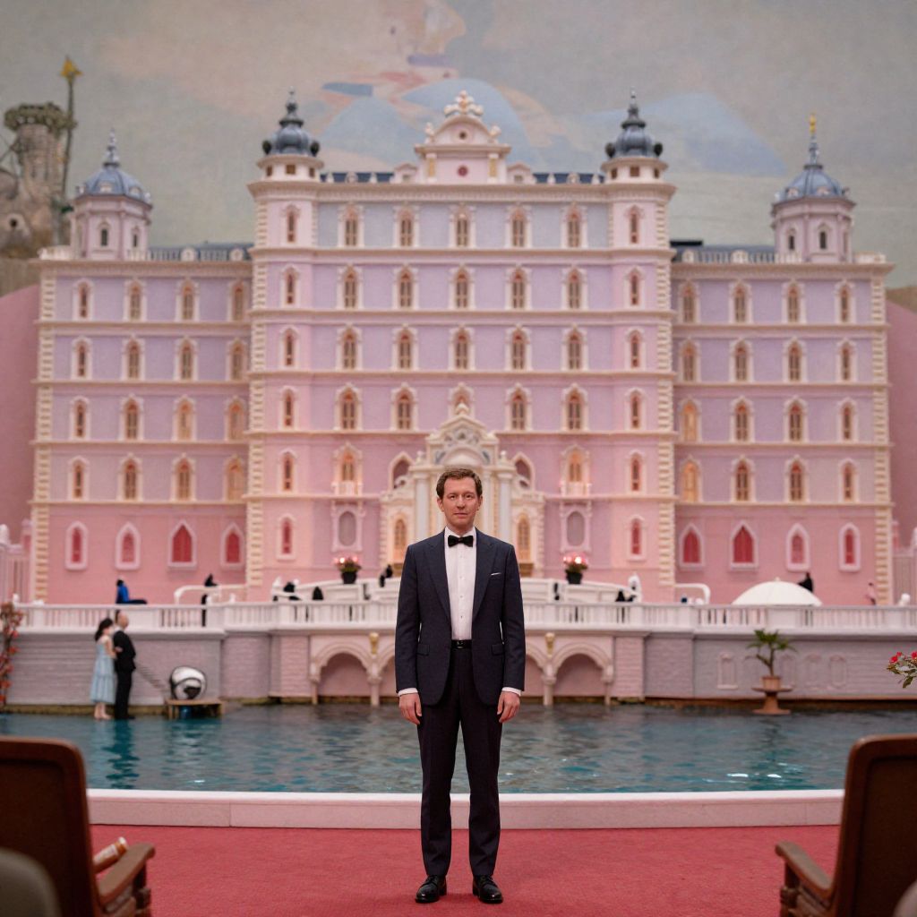 Post-Production 33 years old man in the style of wes anderson, stop motion movie, the grand budapest hotel, the royal tenenbaums, the life aquatic, wes anderson theme, symmetric,
