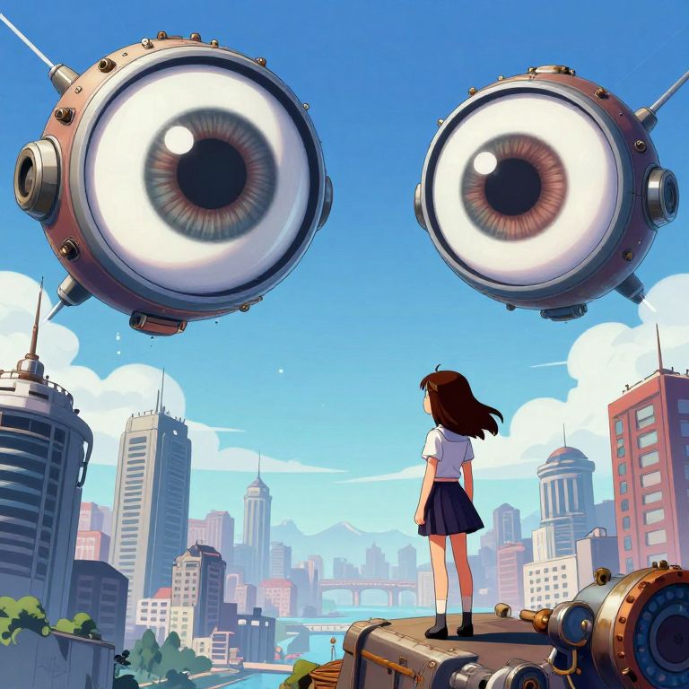 Steampunk Big robotic eyes floating in the sky of a futuristic city in 2785 looking at girl , 2D art , 2000s,