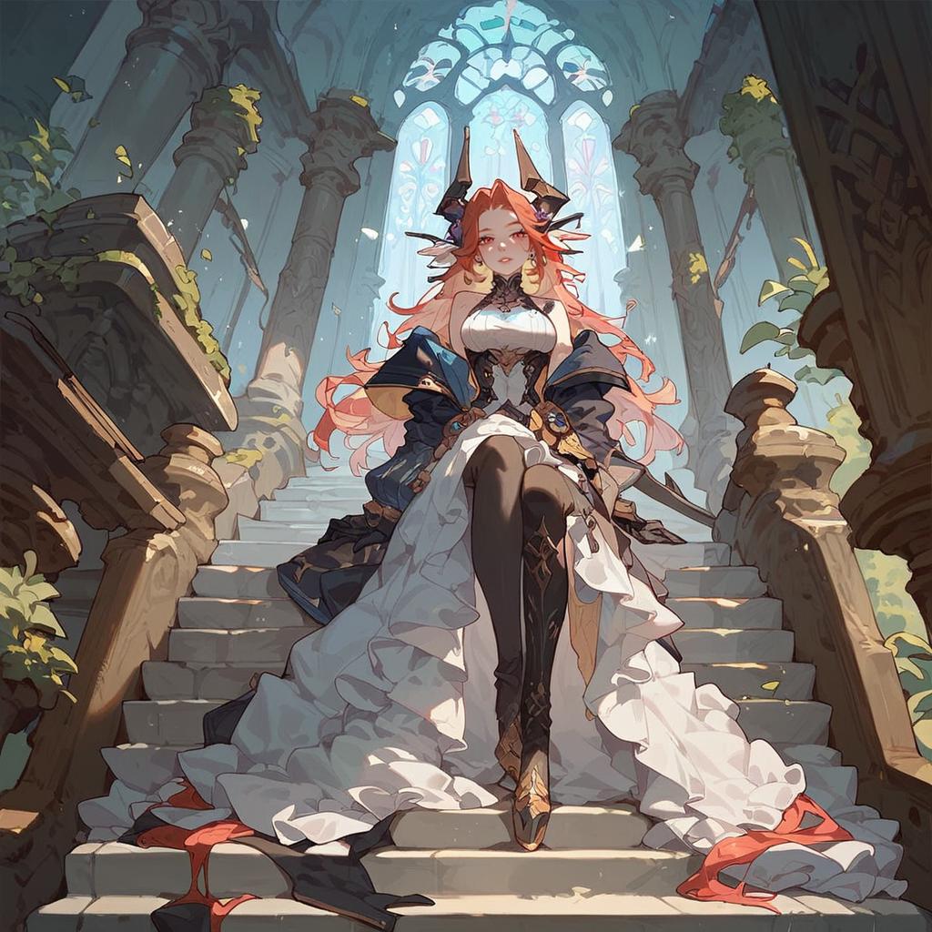 Score_9, score_8_up, score_7_up, by Serpieri, woman, stairs, cloaked figures, machinery