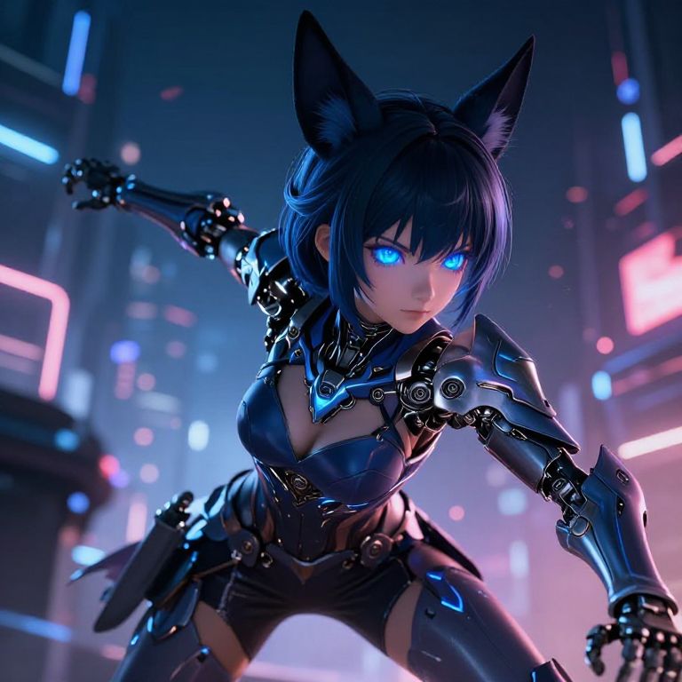 Cat girl Genshin Impact in a mystical cityscape at dusk, sleek futuristic armor with cat motifs, glowing eyes, dynamic action pose, anime style, vibrant neon colors, detailed environment.