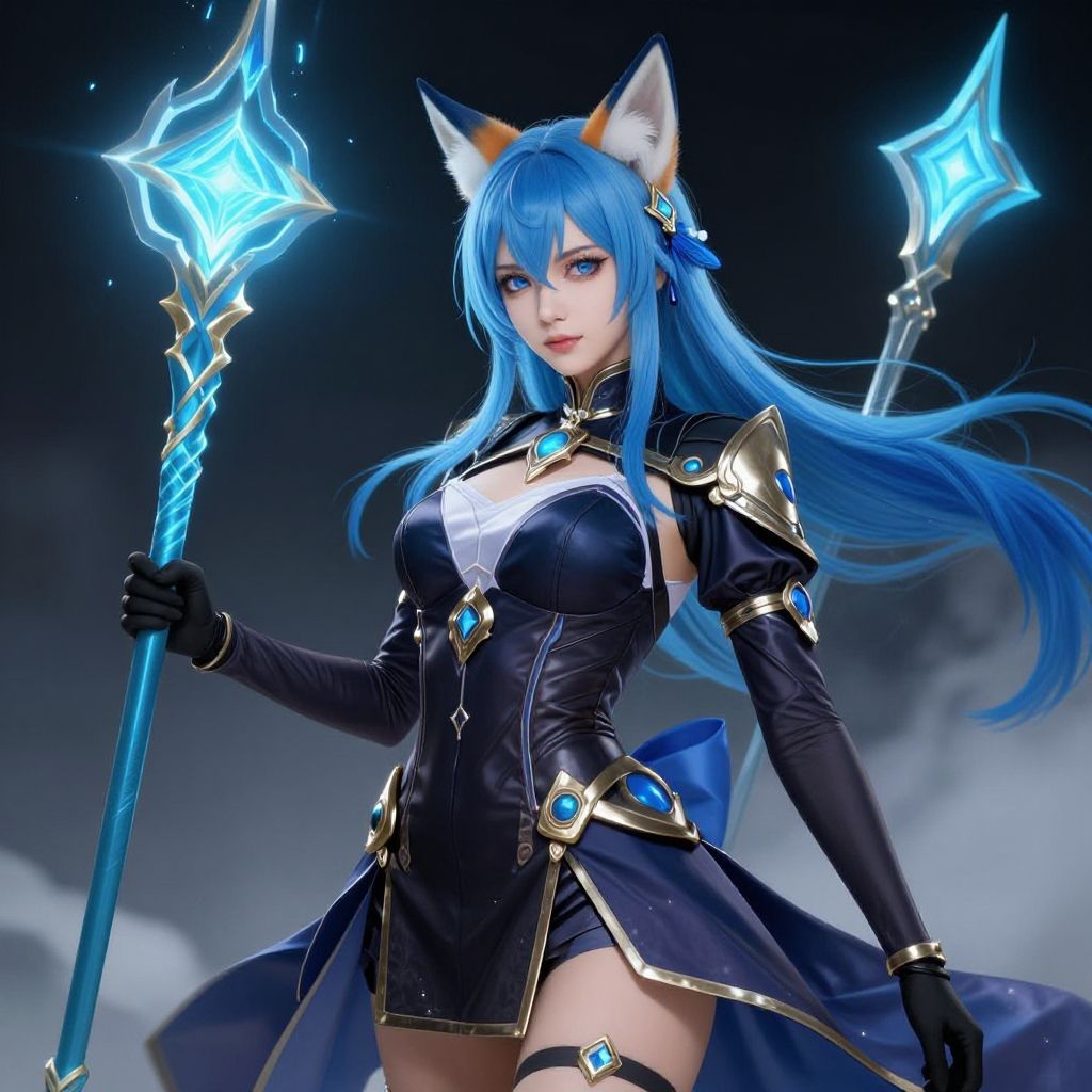 Digital anime-style artwork of a blue-eyed, black-haired catgirl with cat ears and a tail, wearing a form-fitting, black futuristic bodysuit with glowing blue accents and metallic chest piece. She's in a dynamic pose with one arm raised and one leg lifted, set against a vibrant, neon-lit cityscape with towering, ornate buildings and floating lights. Her expression is determined, and the background is filled with soft, purple and blue hues, creating a futuristic, cyberpunk atmosphere. The artwork is highly detailed, with a mix of soft and sharp textures.