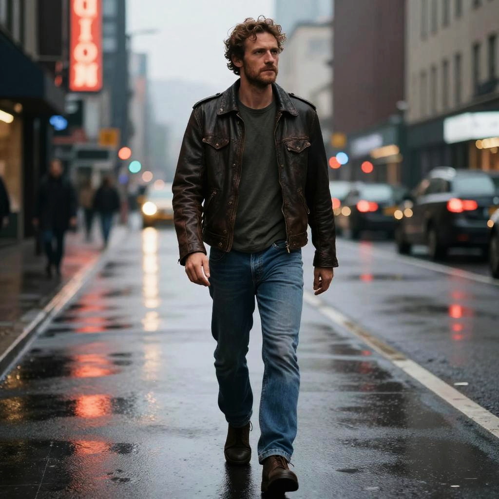 Sigma male photo, rugged man walking alone on an empty city street, wearing leather jacket and jeans, dusk with neon lights reflecting on wet pavement, contemplative expression, natural but dramatic lighting, cinematic urban vibe