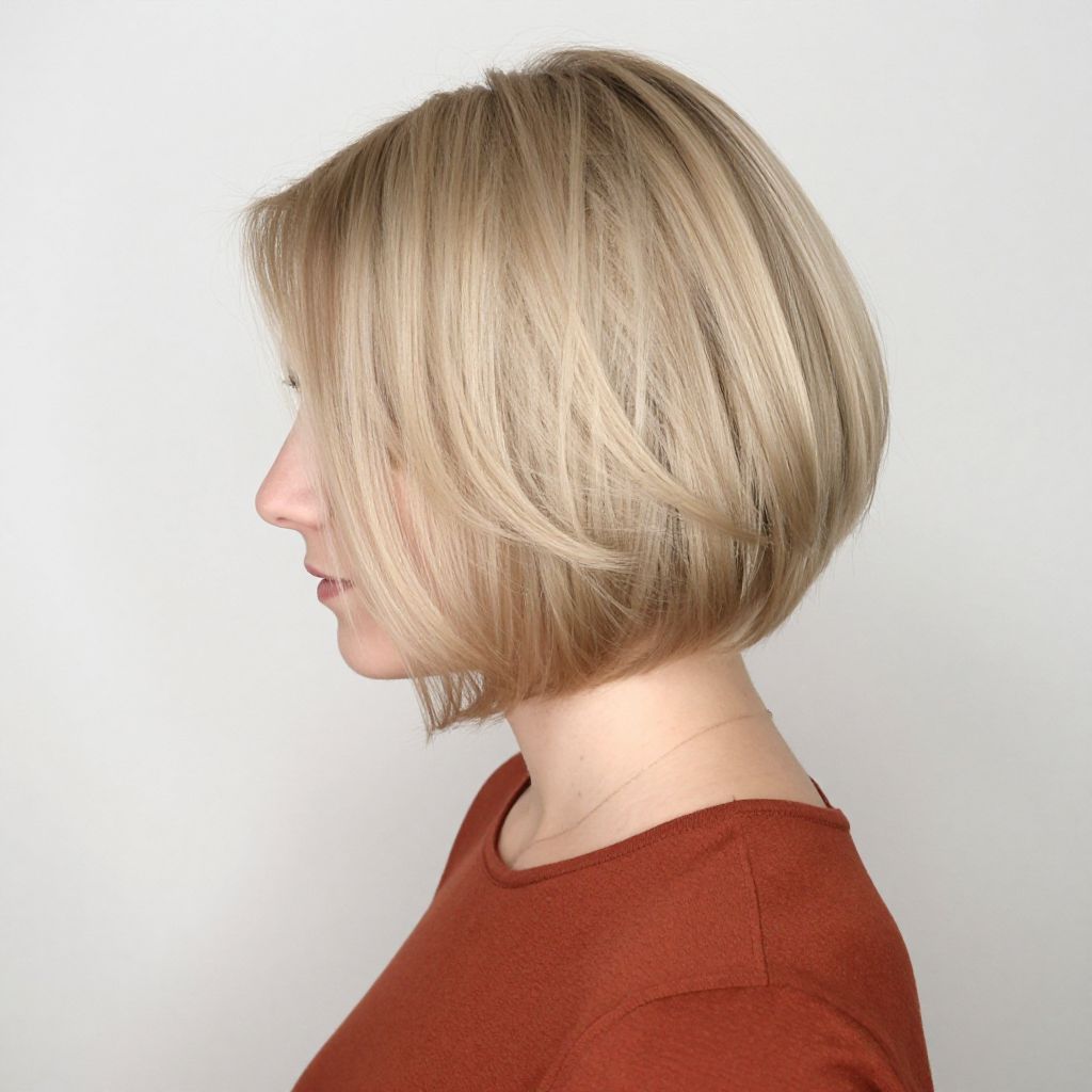 Stylish short blonde rounded bob hairstyle featuring layered cuts and subtle highlights, showcased by a woman wearing a rust-colored top against a clean white background.
