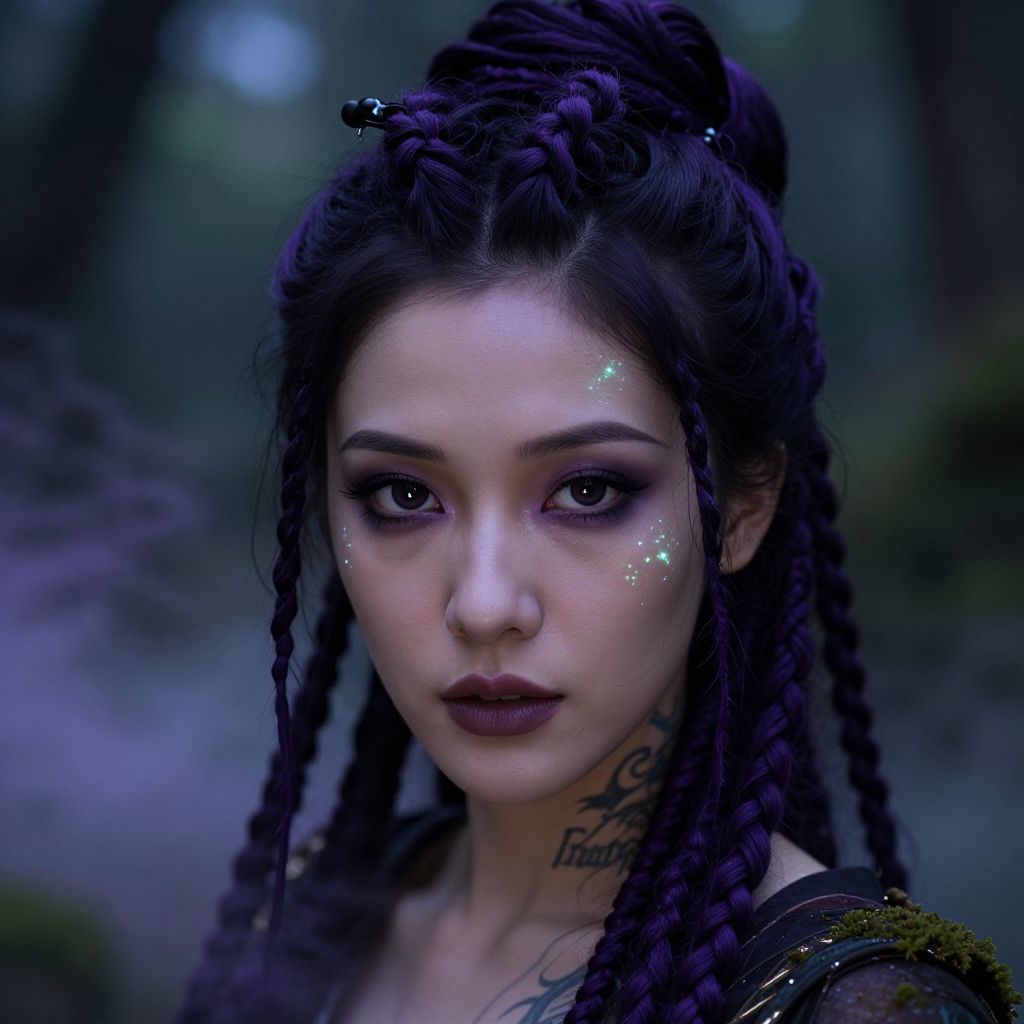 Close-up portrait of a person with dark purple dreads styled into an elegant updo, glowing bioluminescent tattoos on their face, surrounded by mystical forest elements, ethereal fog, and enchanted purple hues blending with natural greens.