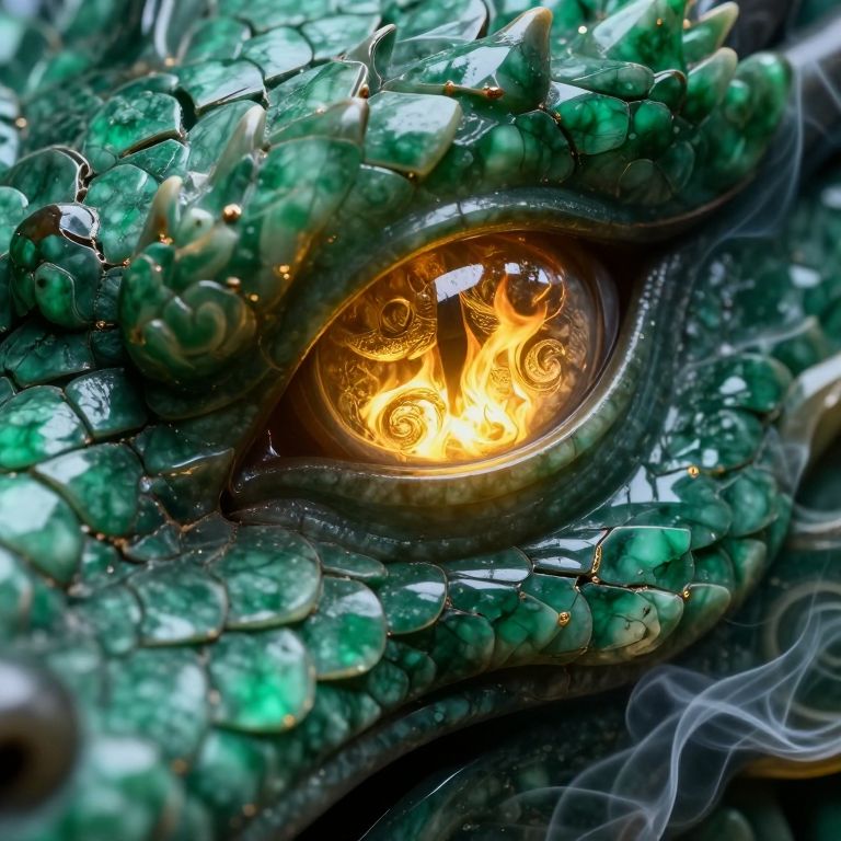 A dramatic vertical close-up of a dragon's eye, its slit-pupil glowing with a fierce golden hue, reflecting flames and the glint of ancient treasures, The surrounding skin is textured with intricate patterns of jade-green scales, each one polished and gleaming as if carved from precious stone, catching light in a mesmerizing interplay of highlights and shadows, Tiny cracks and veins run across the scales, giving them a lifelike, ancient quality, The eye itself is alive with vivid details—fiery wisps and swirling, molten textures within the iris, radiating power and intensity, Soft tendrils of smoke rise around the edges, curling delicately against the dragon's emerald hide, adding to the mythical, awe-inspiring atmosphere