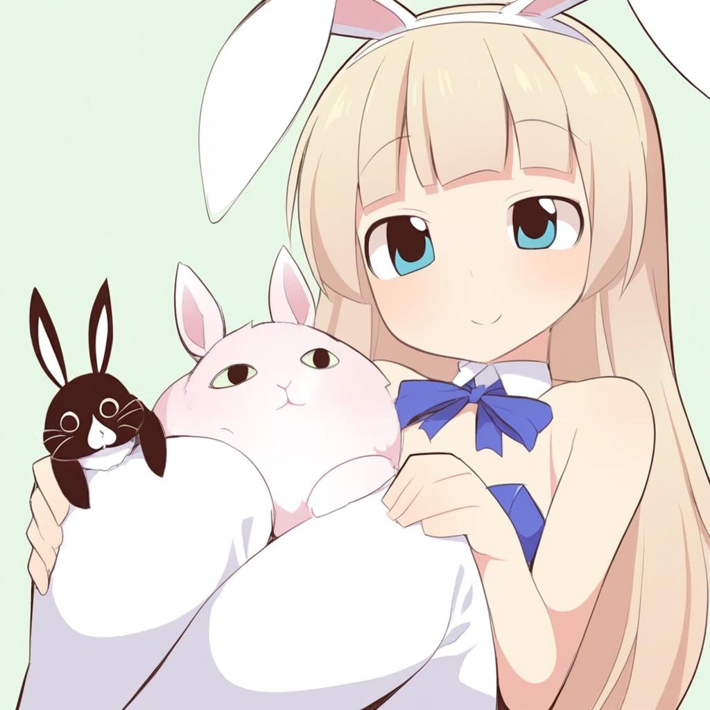 Illustration of an anime-style girl with long blonde hair and blunt bangs wearing rabbit ears and a blue bow tie. She is holding two plush rabbits, one black and one pink. The artwork features a soft color palette and a gentle expression on the girl's face.