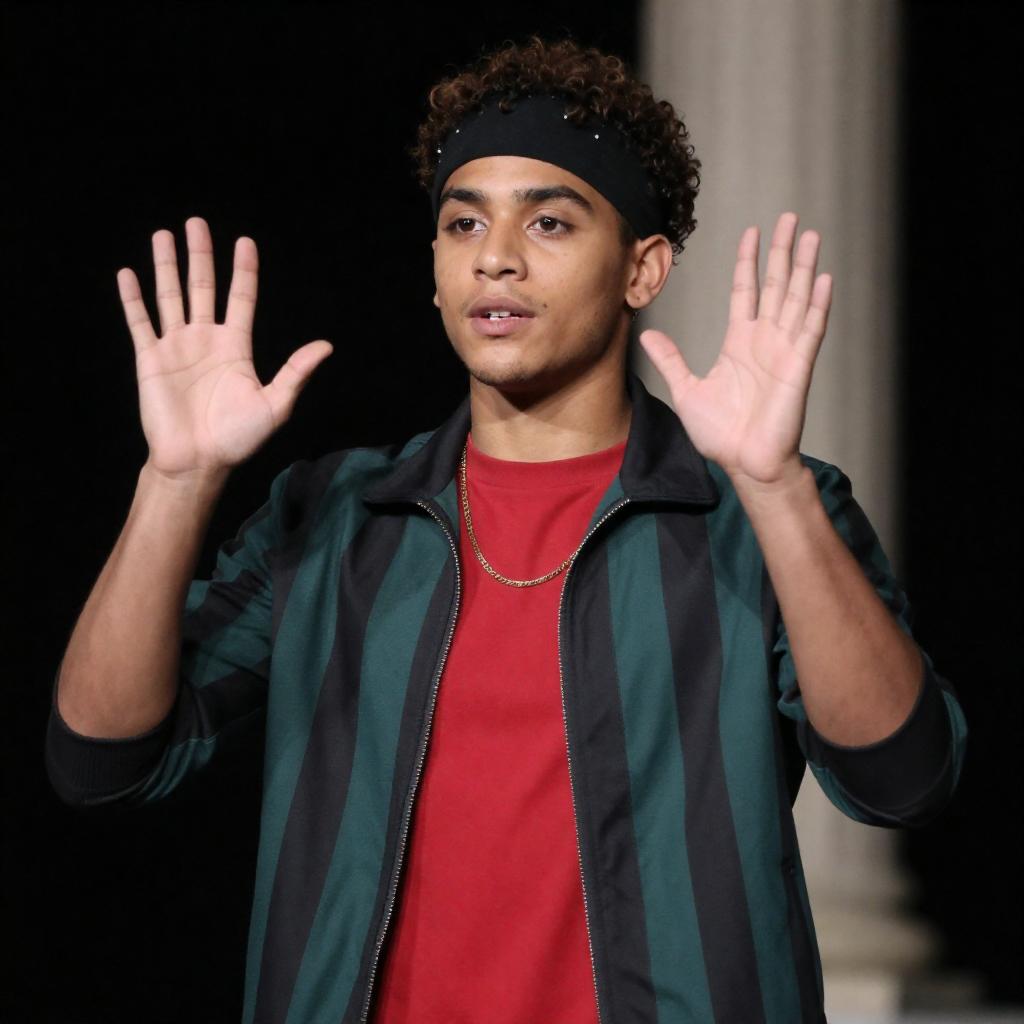 Photograph of a young man with short, curly brown hair, wearing a black headband, red t-shirt, and a green and black striped jacket. He has a gold chain necklace and is mid-motion with his hands raised. The background is dark with a faintly visible column. The lighting highlights his face and upper body.
