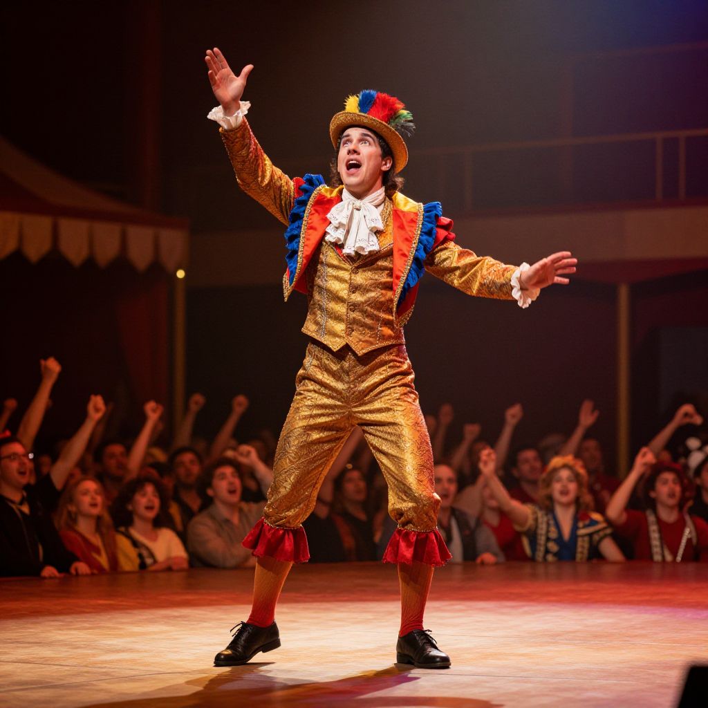 Showman on a grand stage, spotlight highlighting flamboyant costume, vibrant colors, energetic crowd in background, vintage circus vibe, dynamic pose, rich textures, cinematic lighting, festive atmosphere, detailed character expression
