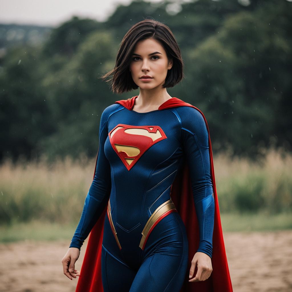 A blonde woman wearing a white bodysuit and red cape inspired by the Supergirl costume, standing outdoors with a city skyline in the background. She has long hair, blue eyes, and a focused expression, looking directly at the viewer. The urban environment is slightly blurred, emphasizing the subject.