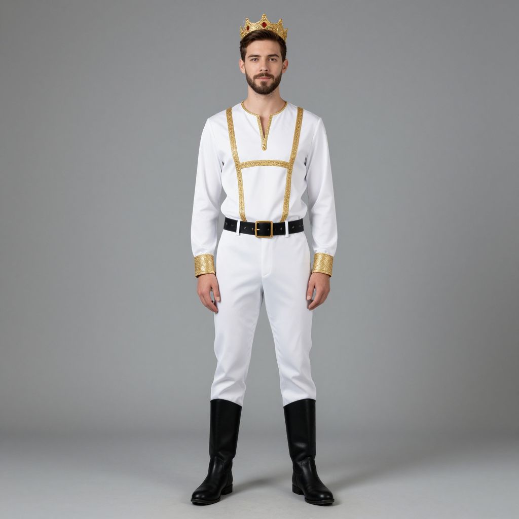 Prince costume man, 1boy, solo, male focus, facial hair, crown, boots, beard, full body, standing, mustache, white pants, looking at viewer, pants, long sleeves