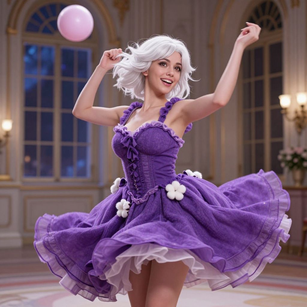 This CGI image features a smiling, white-haired woman in a vibrant purple, sleeveless, Victorian-style dress with white flower embellishments. The dress has a fitted bodice with lace-up detailing and a voluminous, flared skirt with layers of sheer fabric. She is posed with her arms raised, mid-twirl, and a pink balloon floats above her head. The background shows an ornate, elegant room with large, arched windows, white walls, and gold accents. Warm light from wall sconces illuminates the scene, adding a soft glow to the room. The woman's joyful expression and dynamic pose contrast with the sophisticated, classic setting.