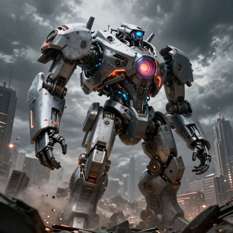 Photorealistic digital artwork depicting a towering, battle-worn mecha robot with a metallic, rusted exterior standing amidst a ruined urban landscape. The robot has large, armor-plated limbs, a glowing blue eye on its chest, and intricate mechanical details. The sky in the background is dramatic, with dark, stormy clouds tinged with orange and pink from the sunset. Debris and shattered buildings surround the mecha, suggesting a recent battle. The robot's design is reminiscent of Gundam or Evangelion style, with a mix of futuristic and industrial aesthetics. The scene conveys a sense of destruction and resilience.