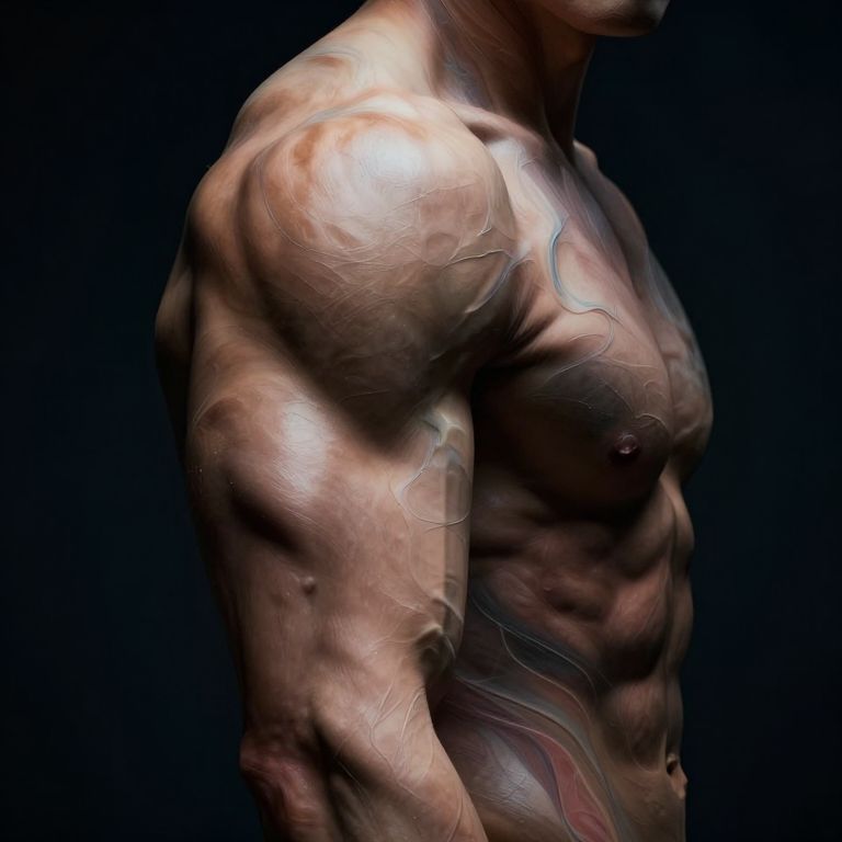 This is a digital CGI image of a muscular, shirtless man shown in profile against a dark background. The man's skin has a realistic texture with visible veins and muscle definition, highlighting his well-developed upper body. His left shoulder, arm, and part of his chest are prominently displayed. The lighting emphasizes the contours of his muscles, creating a shiny, almost wet look on his skin. The background is solid black, which contrasts with the illuminated, detailed skin. The image focuses on the anatomical details and physical strength of the man's upper body.