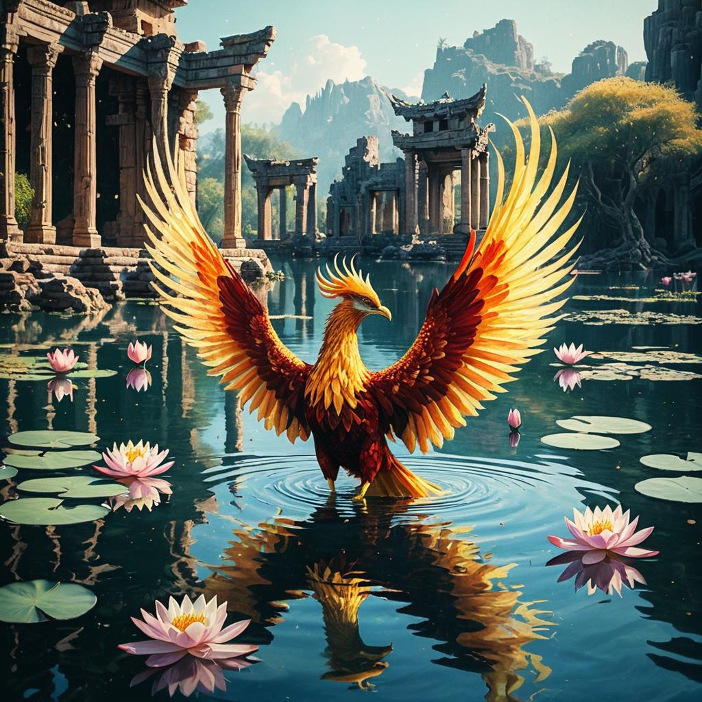 A griffin, fiery orange and red feathers with smoky trails, crumbling temple ruins at dawn, majestic and rhythmic.