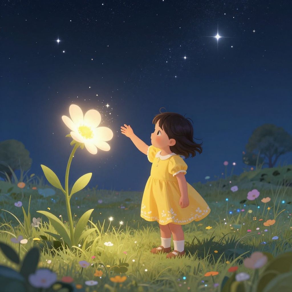 In a celestial meadow where stardust whispers secrets to the night, a child reaches out to a radiant flower, its petals glowing like a beacon of wonder, igniting a spark of hope and connection in the vast, starlit expanse.