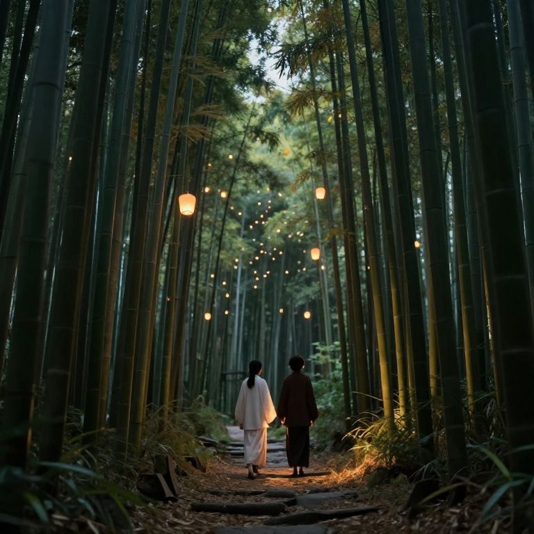 Photograph of a serene forest path lined with tall, slender bamboo trees. Two figures, a person in a white kimono and another in a black robe, walk away from the camera down the path, holding hands. The path is illuminated by a series of warm, glowing lanterns hanging from the bamboo above. The forest floor is covered in dry leaves, and the background is dimly lit, creating a peaceful, ethereal atmosphere. The colors are predominantly green from the bamboo and the warm glow of the lanterns contrasts with the dark forest. The image evokes a sense of tranquility and intimacy.