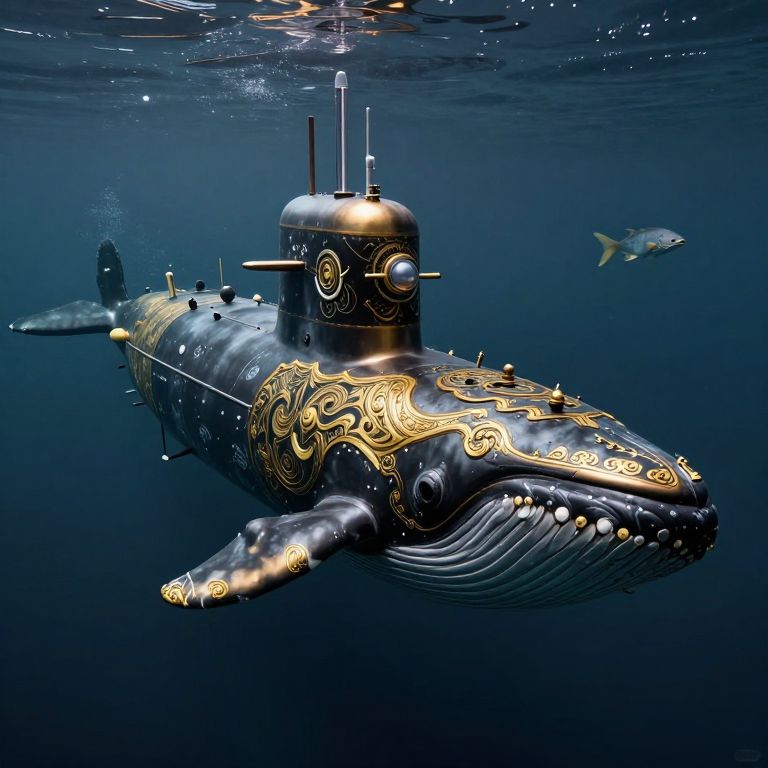 A highly detailed, intricate submarine with ornate black and gold decorations, floating underwater with a whale and fish, in a dark, ominous environment.