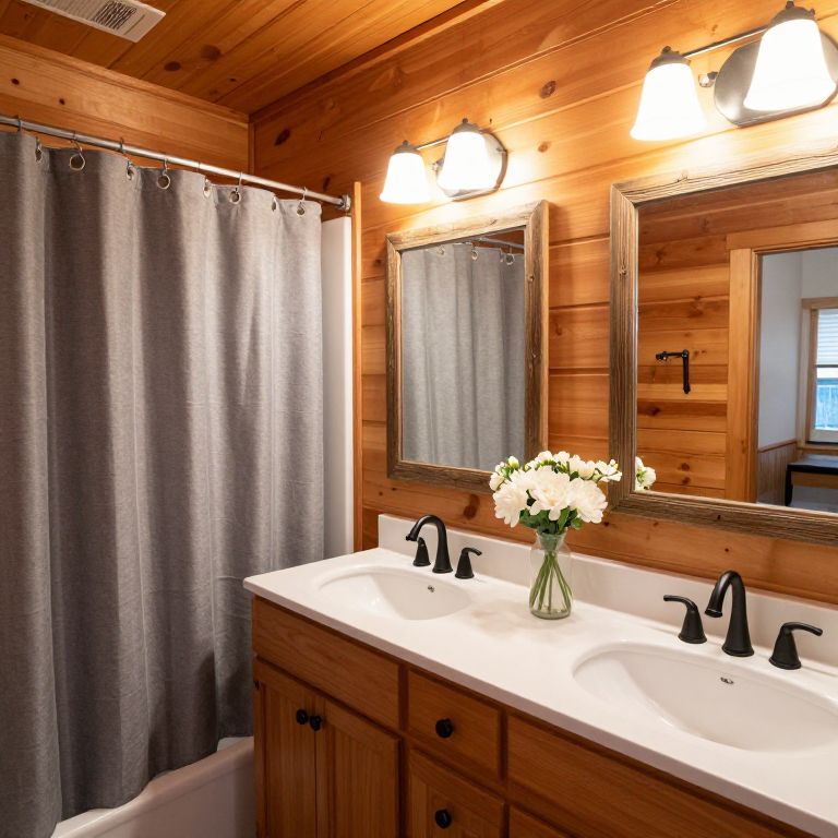 Photograph of a rustic bathroom with warm wooden-paneled walls and ceiling. A white double sink vanity with black faucets and dual mirrors is centered, topped with a white countertop and a vase of white flowers. Above the mirrors, two light fixtures with frosted glass shades illuminate the space. To the left, a gray shower curtain hangs over a bathtub. A reflection of a window and a small table can be seen in the right mirror. The overall lighting is soft, enhancing the wood's natural grain and texture.