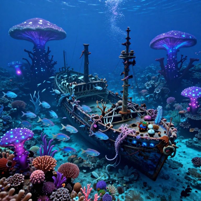 This vibrant digital artwork depicts an underwater scene featuring a sunken, rusted ship surrounded by colorful marine life and bioluminescent mushrooms. The ship, adorned with barnacles and coral, is centrally positioned, with its masts and rigging reaching upwards. Blue and purple bioluminescent mushrooms with glowing spots illuminate the background. Various corals and sea anemones in pink, purple, and blue hues populate the seafloor. Schools of small, blue fish swim around the ship, adding dynamic motion. The deep blue water creates a mystical, otherworldly atmosphere, enhanced by bubbles rising to the surface. The image's vivid colors and intricate details evoke a fantastical, underwater fantasy.
