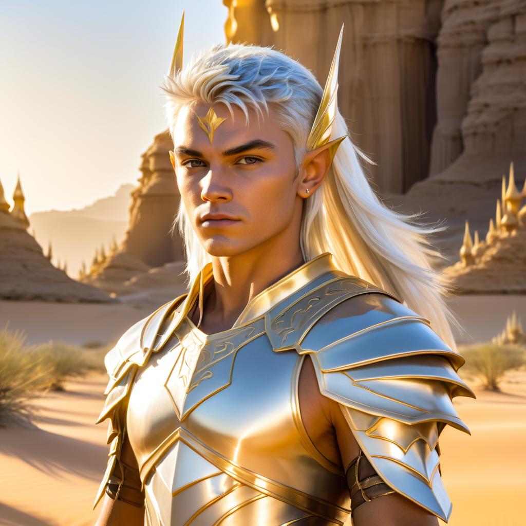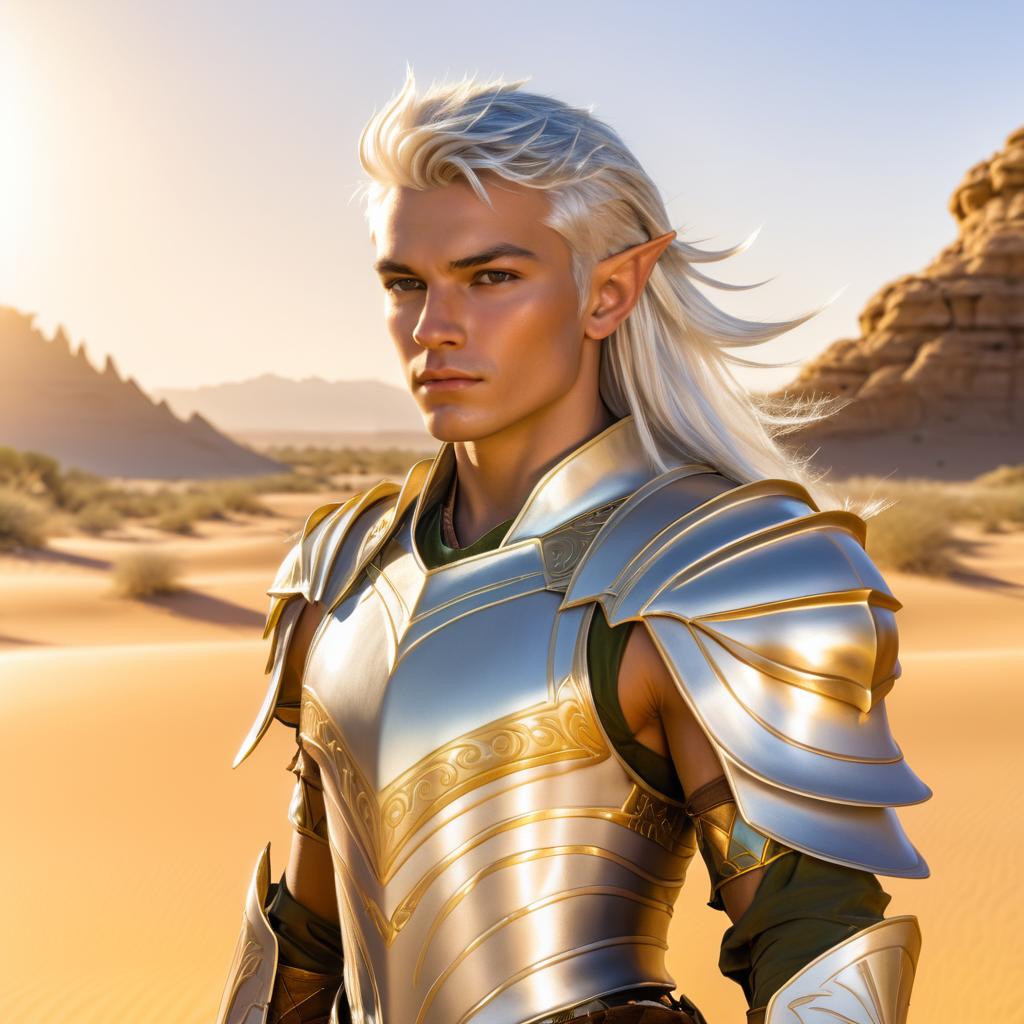 Portrait of a muscular teenage elf with golden skin, shimmering silver hair, and pointed ears, standing in a desert landscape. The elf is wearing intricately designed silver armor with gold accents, blending fantasy and heroic themes. The background features sunlit sand dunes and rocky formations under a clear sky.