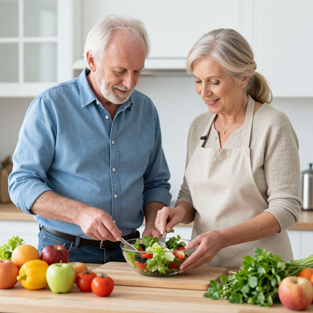 Two older adults, a man in a blue shirt and a woman wearing a beige apron, prepare a fresh salad together at a wooden kitchen counter, surrounded by vibrant fruits and herbs, emphasizing a focus on healthy eating.