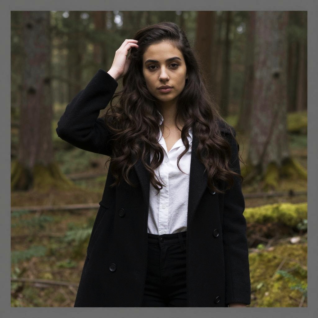 Photograph of a young woman standing in a forest. She has long, wavy black hair and olive skin, with dark, expressive eyes. She wears a white button-up shirt under a black coat, and black pants. Her right hand is touching her hair, while her left arm rests at her side. The background features tall trees with moss-covered trunks and a forest floor with greenery. The image has a soft focus, with a gray border framing the scene. The overall mood is mysterious and natural.