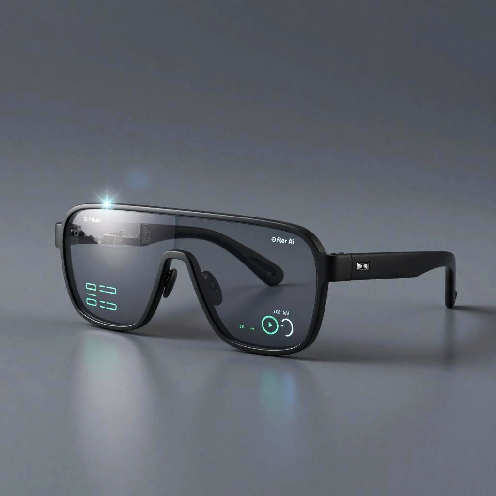 Filter AI embedded in smart glasses, showing real-time data filtering through augmented reality lenses with a cityscape reflected, sleek design, minimalistic style with cool tones and subtle light flares, cutting-edge technology vibe.
