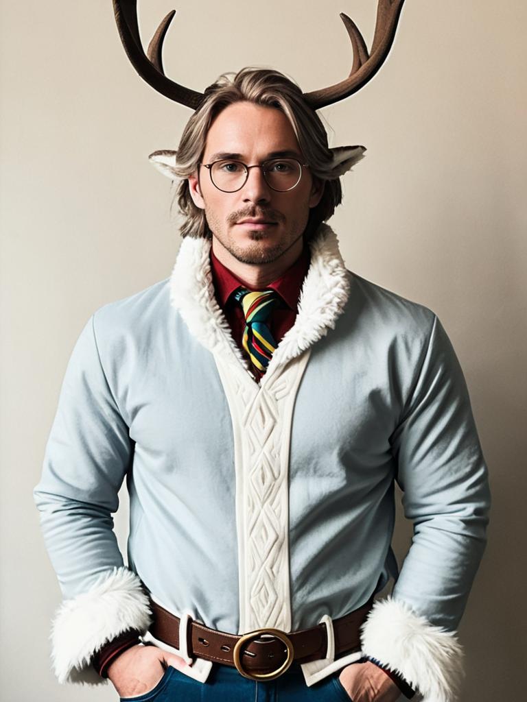 A young man dressed in a realistic Sven Vollfied costume featuring light blue fur-trimmed jacket, colorful striped tie, brown belt with large round buckle, and distinctive antler headpiece with ears. He has light brown hair, glasses, and a neutral expression, standing against a plain background.