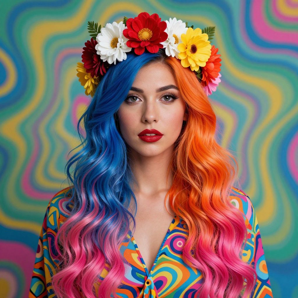 This vibrant digital artwork features a beautiful woman with long, wavy hair that transitions from deep blue to bright orange and pink. She's wearing a colorful floral crown with red, white, and yellow flowers. Her dark eyes and red lips stand out against the swirling, psychedelic background of greens, yellows, blues, and pinks. She's dressed in a matching, patterned top. The overall style is surreal and energetic.